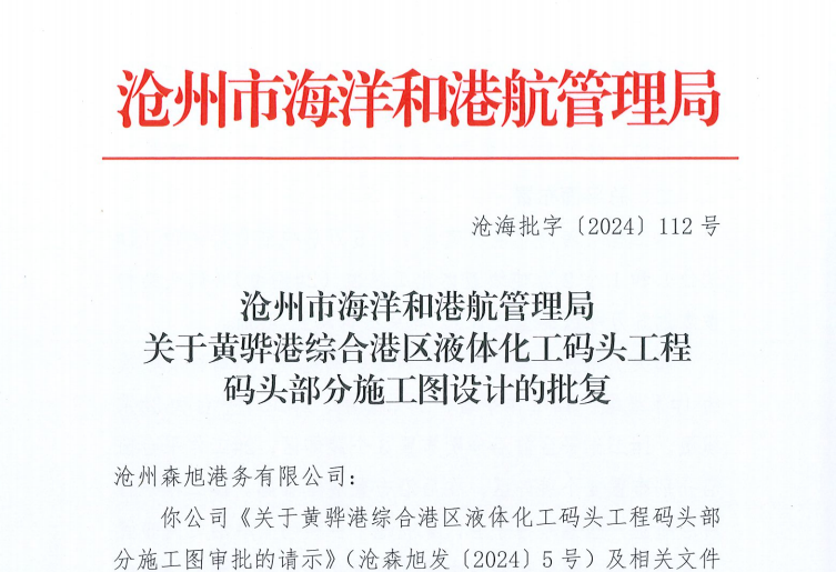 4月15日,黄骅港综合港区液体化工码头工程码头部分施工图设计获沧州市海洋和港航管理局批复。此项批复标志着液体化工码头工程建设取得重大进展,为码头部分的施工奠定了坚实基础。