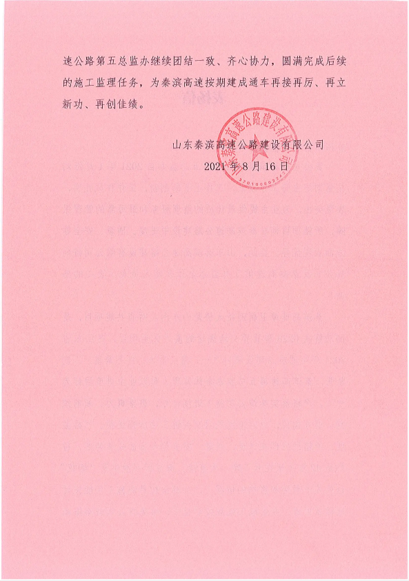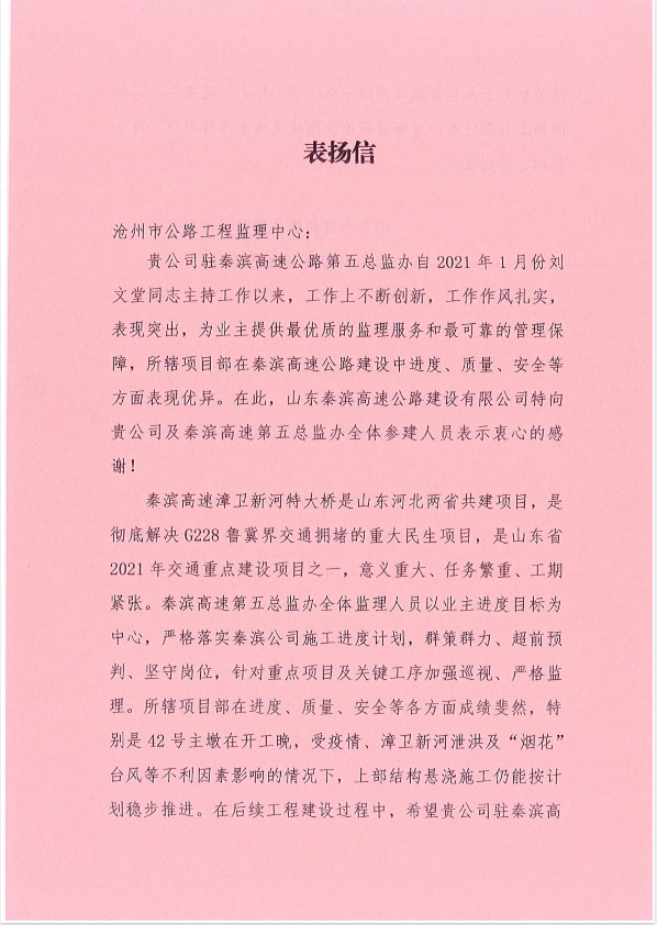监理中心稳步推进秦滨高速漳卫新河建设项目,获秦滨高速建设有限拼搏在线(中国)唯一官方网站感谢表扬