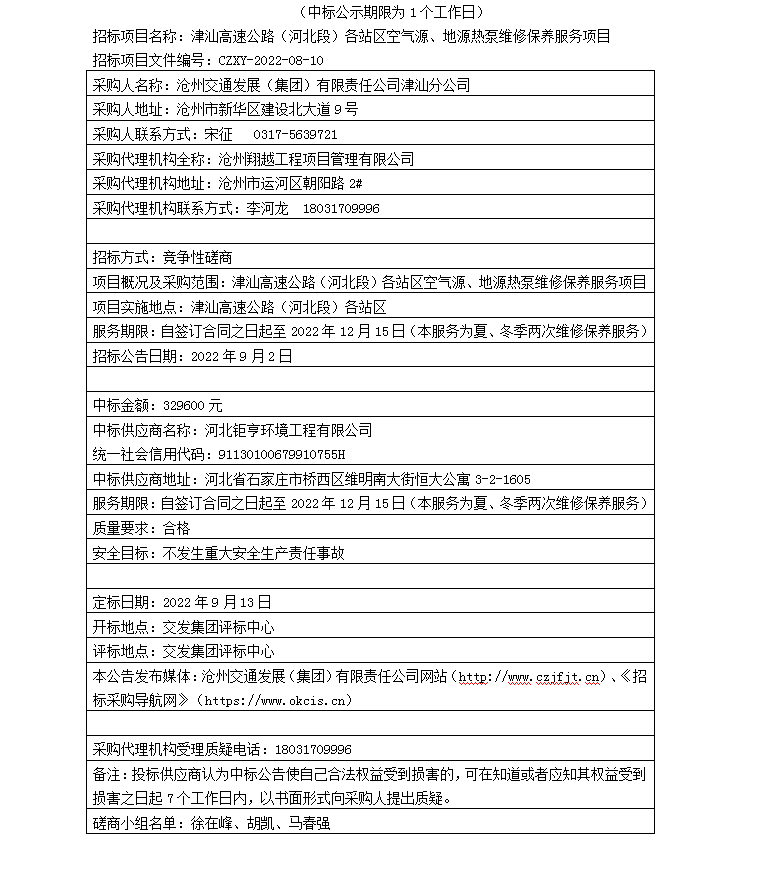 津汕高速公路(河北段)各站区空气源、地源热泵维修保养服务项目中标公告
