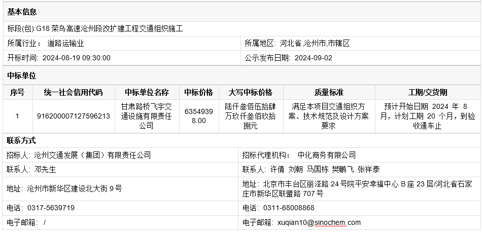 G18荣乌高速沧州段改扩建工程交通组织施工中标结果公示