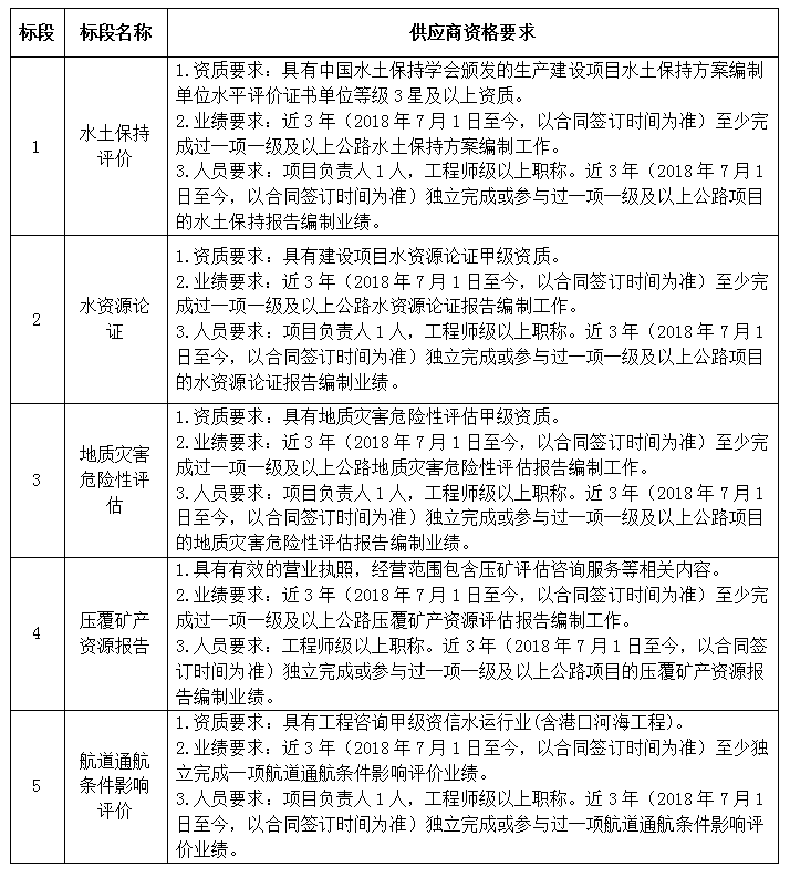 (三)标段划分:5个标段,1标段水土保持评价、2标段水资源论证、3标段地质灾害危险性评估、4标段压覆矿产资源、5标段航道通航条件影响评价。