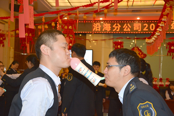 节目继续,精彩不断。吹气球传纸杯、抢凳子、一圈到底、面部吃饼干等各式各样的小游戏让人轻松愉快、回味无群。